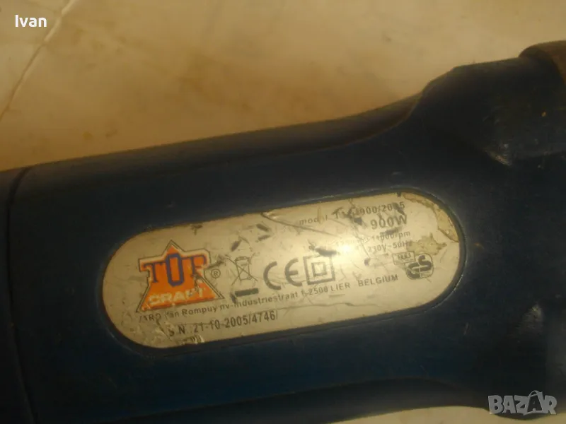 Оригинален белгийски ел. ъглошлайф, среден 900 ватов модел на Топ Крафт. Машината не тръгва и бие ток от нея при вклчване. Предлага се цяла