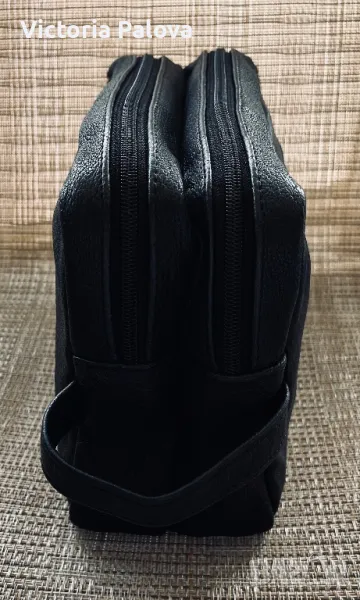 Удобна и вместителна чанта-несесер с две отделения с ципове и един външен джоб с цип, широчина - 26см, височина - 18см, дъното - 26см на 10см. Кожата е мека и гладка. Чантата е подходяща за мъже и жени.