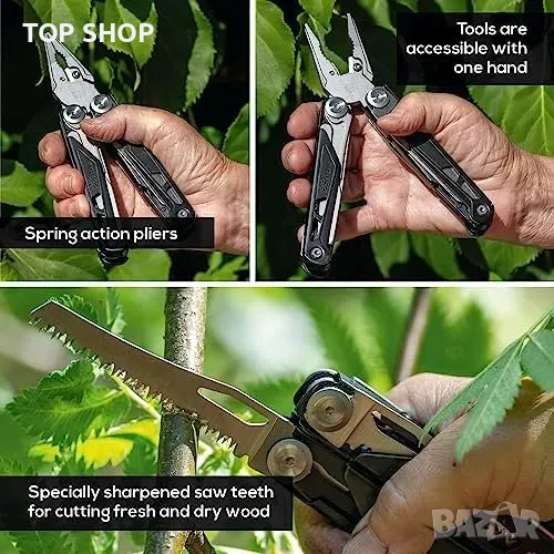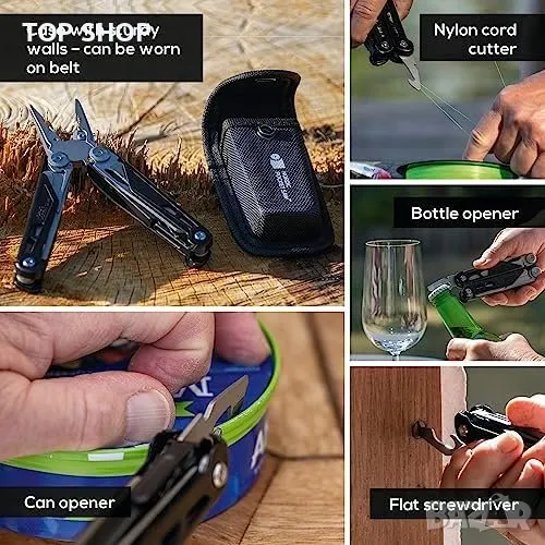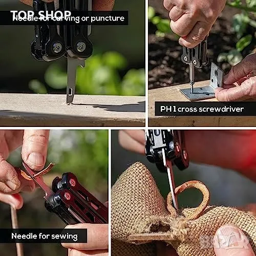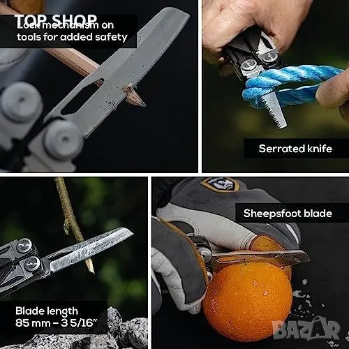 Допълнителни функции: Отварачка за консерви, отварачка за бутилки, ножица, игла, нож за рязане на найлонов кабел.