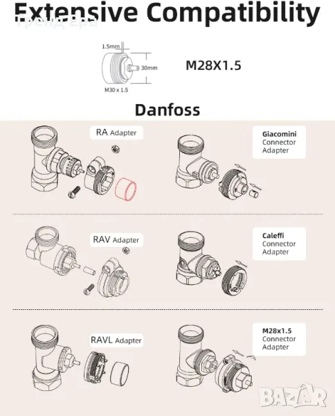 Съвместимост с височина: Нашият интелигентен термостат е съвместим с най-често срещаните вентили на пазара, напр. Danfoss (RA, RAV и RAVL), Caleffi, Giacomi, M30x1.5mm и др.