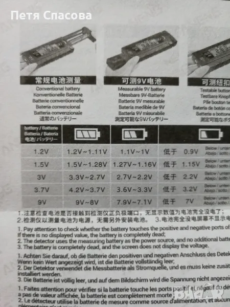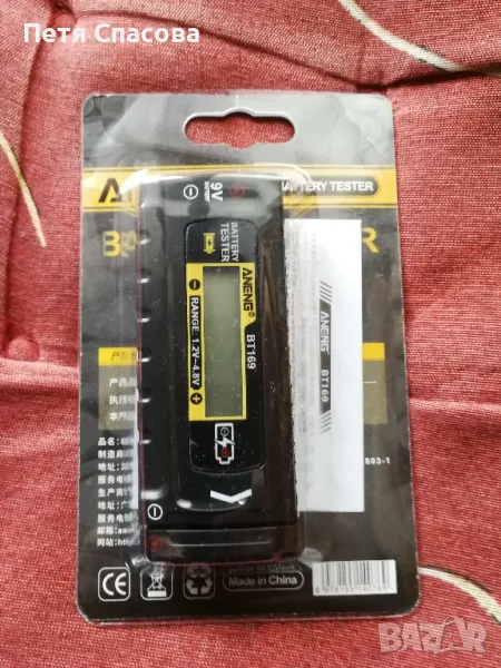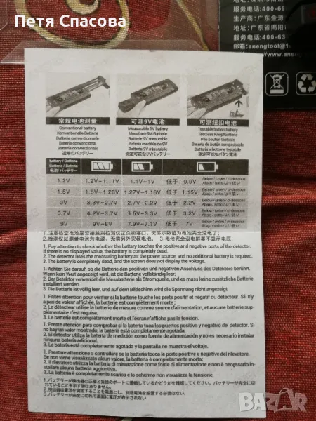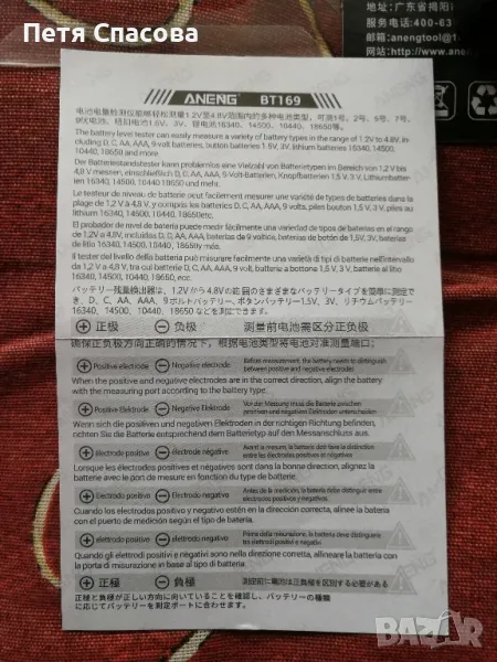 Дигитален Тестер за Батерии ANENG BT 169. Към комплекта има книжка с описание и характеристики на няколко езика.