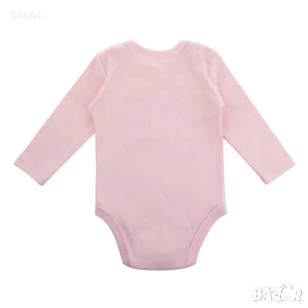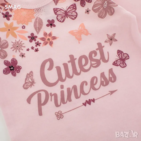 Бебешко памучно боди с дълги ръкави, долно закопчаване, розово с флорален дизайн с пеперуди и надпис "Най-сладката принцеса".