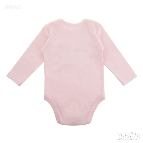 Бебешко памучно боди с дълъг ръкав, закопчаване отдолу, розово с дизайн на различни сладки и послание "Най-сладкото малко кексче".