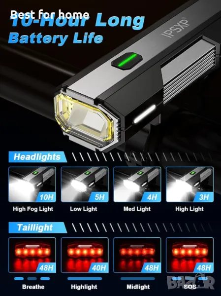 【Дълъг обхват】: 3000 mAh Батерия с голям капацитет с до 10 часа живот на батерията, нощно каране без страх, достатъчно за вашите нужди за каране на открито. Осигурява 4 светлинни режима: къси светлини (10 часа живот на батерията), стандартна яркост (5 часа живот на батерията), средна яркост (4 часа живот на батерията) и максимална яркост (3 часа живот на батерията). (конектор тип C)
