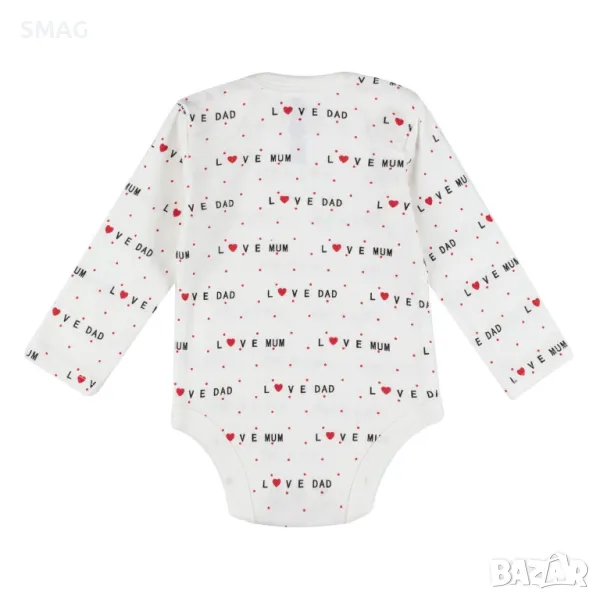 Бебешко памучно боди с дълъг ръкав, закопчаване отдолу, бяло с щампа I love Mum, I Love Dad.