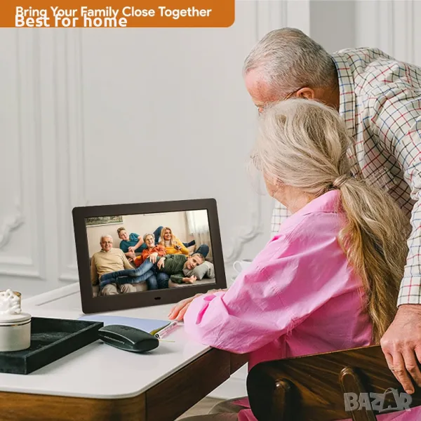 Екранен дисплей с висока разделителна способност: електронна фото рамка 7-инчов HD екран с резолюция 1024x600 показва пейзажи и портрети по-ясно. Споделете моментите си чрез SD карта или USB флаш устройство (до 32 GB). Вградените стерео високоговорители ви позволяват да изживеете ценни спомени, докато слушате звука на спомените. Яркостта на екрана, слайдшоуто и режимът за включване/изключване на таймера могат да се регулират в настройките.