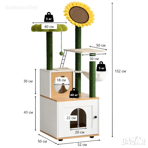 Горната част на двете котешки драскалки е проектирана със зелена плоска подложка с флорална форма, забавна топка за игра и съответно форма на слънчоглед, които могат да привлекат вниманието на вашия любимец.