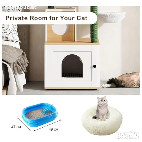 Вътрешното пространство може да побере повечето от котешките тоалетни на пазара (в рамките на 49 см Д x 47 см Ш x 40 см В),или може да бъде котешко легло.