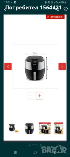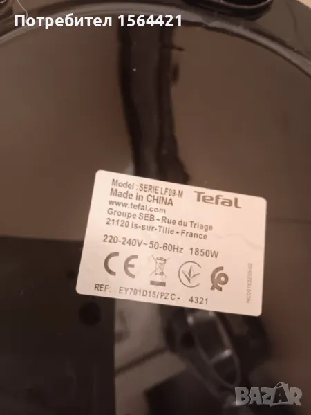 Tefal, Easy Fry XXL, Уред за готвене с горещ въздух EY701D15, 5.6л. Ползван броени пъти, без забележки, работи отлично. Easy Fry XXL е оборудван с технология за готвене с въздух, наречена Hot Air Technology, която работи с помощта на горен нагревателен елемент и оптимизиран въздушен поток. Hot Air Technology придава на храната несравнима коричка отвън, запазвайки я крехка отвътре, с малко или без мазнина. Пържене, гриловане или печене с малко мазнина или без* за всички ваши любими ястия. От хрупкави пилешки късчета до шоколадови кексчета, домашни пържени картофи и вкусни скаридени хапки, изберете ястието и оставете уреда да задоволи апетита ви! XXL уред с горещ въздух с голям обем от 5,6 л за до 8 порции. Прецизна температура от 80° C до 200° C за идеални резултати всеки път. 60-минутен таймер с автоматично изключвне и автоматичен звуков сигнал. Благодарение на патентованата система с кошница можете да премахнете решетката: тя допринася за улавянето на мазнината от дъното за по-здравословни рецепти. Лесна за почистване кошница. Интуитивен цифров екран. Енергиен клас А. Преслага се без кутия, има включено ръководство.