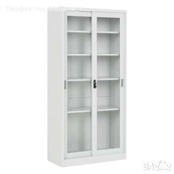 Висок метален шкаф за документи с две плъзгащи се врати с огледално стъкло и заключващ механизъм. Моделът е с 4 рафта с регулируема височина, всеки от които може да носи натоварване до 40 кг