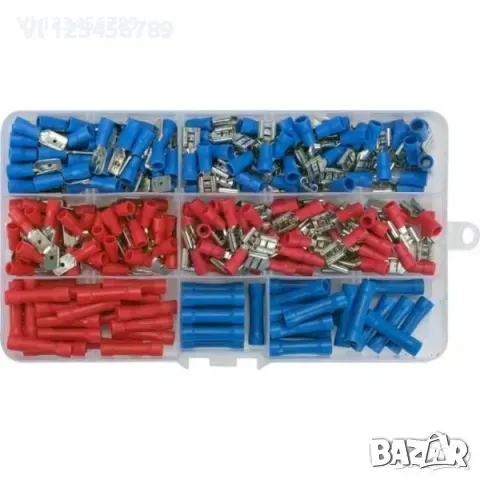 Комплект от 250 броя изолирани кабелни накрайници, поставени в практична пластмасова кутия с разделители.