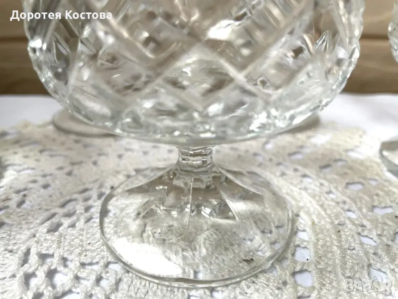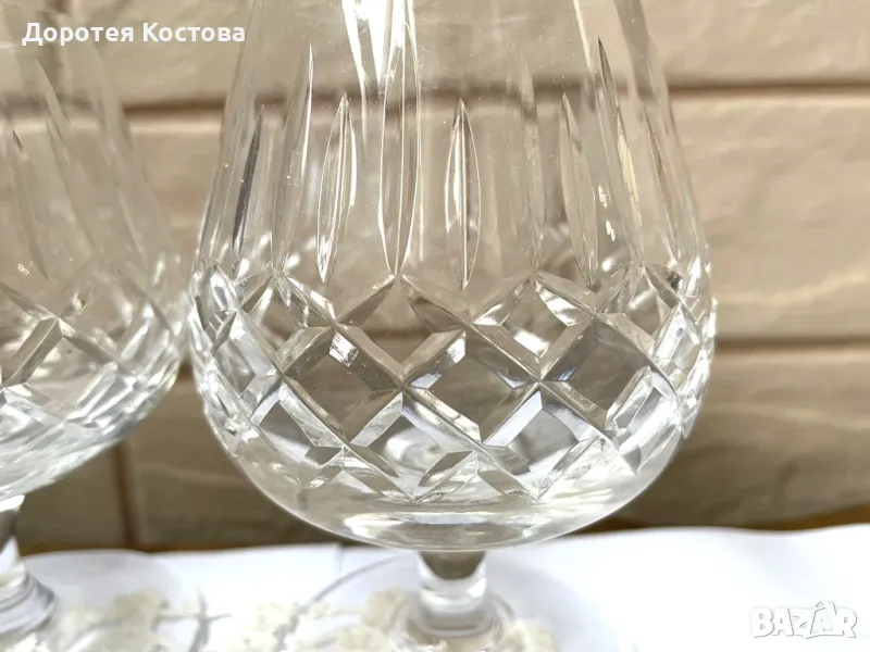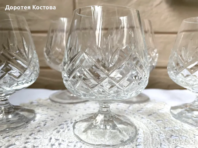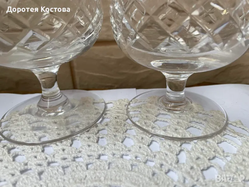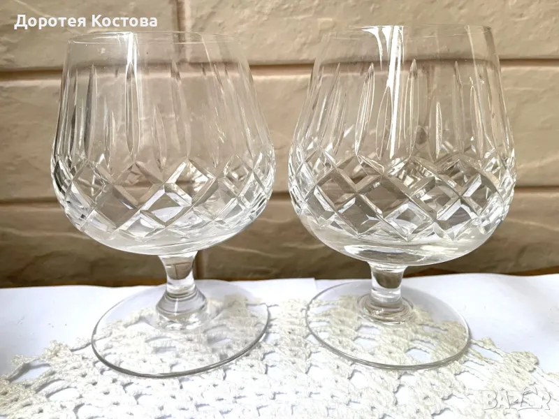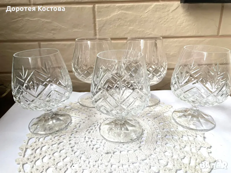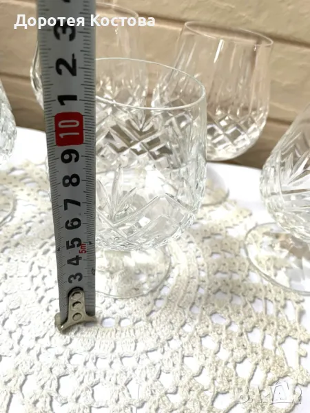Красиви кристални чаши от Англия, 4 бр без забележки с много хубав и продължителен звън, размерите са на снимките. Двете са малко по-големи и различни от останалите три. Петата е подарък, с лепено краче е. Цена - 40 лв.