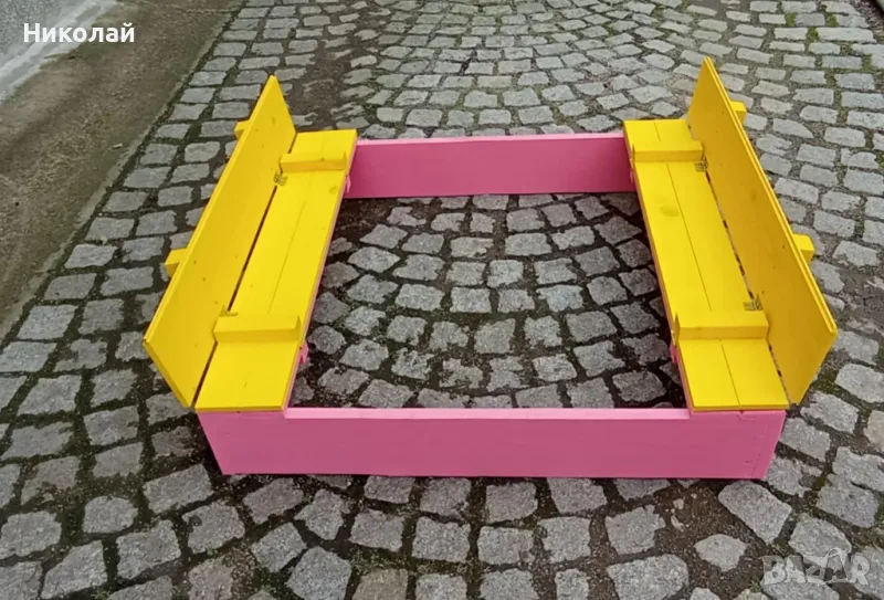 Детски пясъчник изработен от дърво със сгъваеми пейки. Покривът предпазва пясъкът от котки, жаби и други замърсявания, захванат е с панти и щом се отвори се получават две пейки за деца.