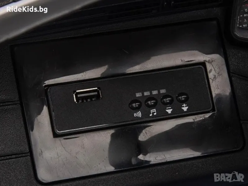 Освен това детската кола е оборудвана със седалка от изкуствена кожа, предпазен колан, гумени гуми, пружинни джанти, 2 истински врати, фарове, осветление на таблото, музикален модул с USB вход и Bluetooth за възпроизвеждане на собствена музика. Тази версия е завършена с лак с висок гланц.