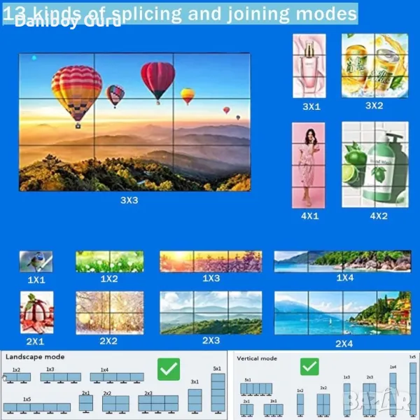 3. Този контролер за видеостена е лесен за снаждане и режимът на снаждане 3X3 може да показва изображения с ултра висока разделителна способност с разделителна способност до 3840x2160 / 60HZ (общата разделителна способност на 9 екрана), поддържа хоризонтален режим и вертикален режим, например: 1x1 / 1x2 / 1x3 / 1x4 / 1x5 / 1x6 / 1x7 / 1x8 / 1x9 / 2x2 / 3x3 и друг произволен ред M, номер на колона с комбинация от режим на снаждане N (поддържа до 9 екрана).
