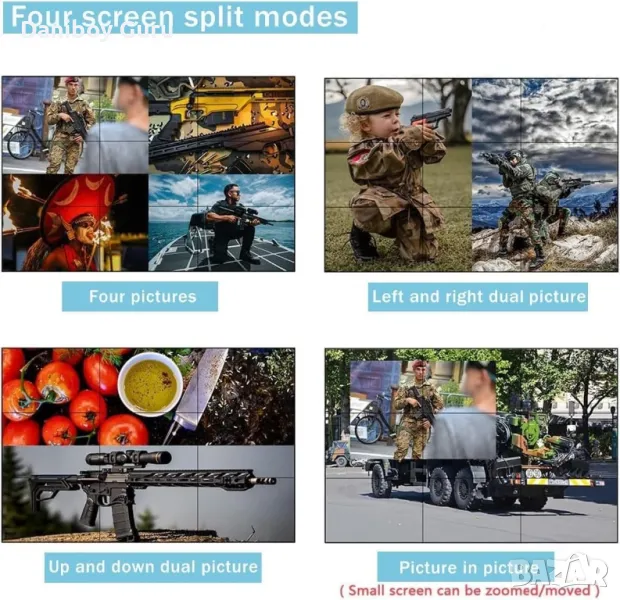 4. Този контролер за видео стена поддържа 4 режима на разделен екран(Четири картини、 Двойна картина нагоре и надолу、 Двойна картина наляво и надясно、 Картина в картина), каналът на входния източник може произволно да бъде присвоен на разделения екран.