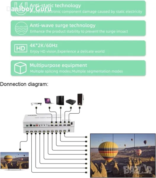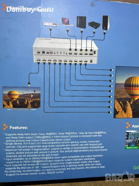 1. Този контролер за видео стена поддържа 4 HDMI и 1 DP входа, 10 HDMI изхода (включително 1 HDMI контурен изход) и може да разделя пълен HDMI или DP сигнал с висока разделителна способност на 9 части и да ги присвоява на 9 видео дисплея. Устройството може да показва група от HD изображения с различни ефекти на снаждане. Каналът на входния източник може произволно да бъде присвоен на разделения екран и има различни ефекти за разделяне на видео.