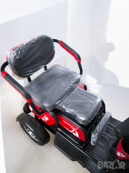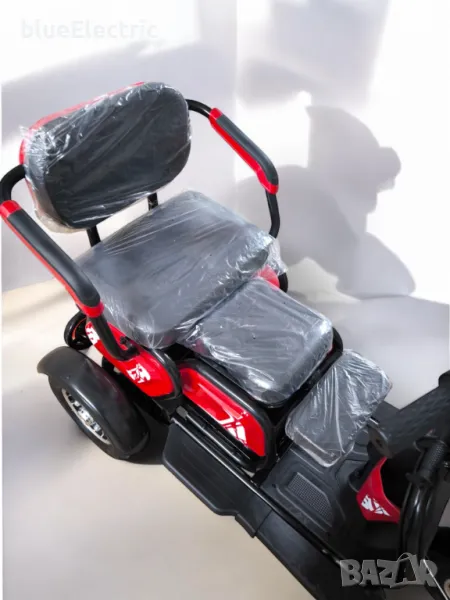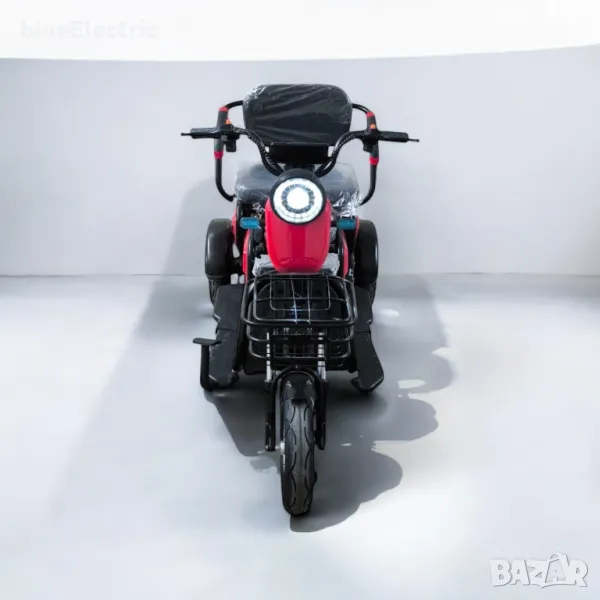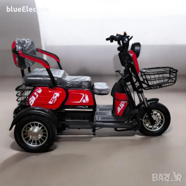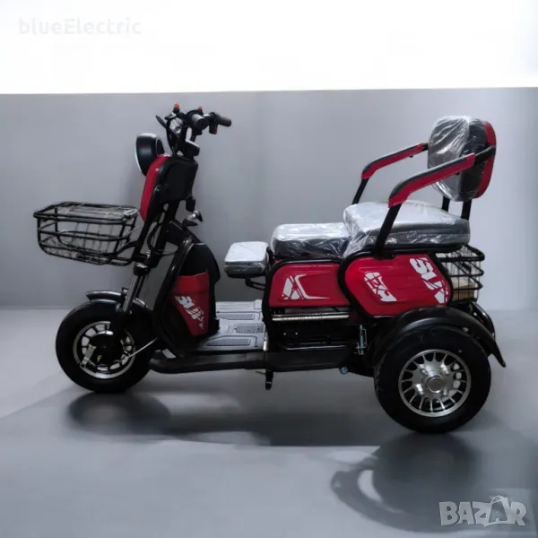 Електрическа триместна триколка blueElectric C1 - без аналог на пазара. Триколката е с дигитално табло, три нива на скоростта, стопове, мигачи и габарити,LED фар. Предна и задна ръчни спирачки. Крачна спирачка. Голям кош за багаж. Триколката е с вградена втора седалка за допълнителен пасажер, като самата седалка се движи във височина, което създава удобство за нисък или висок човек + подарък трета малка седалка.
