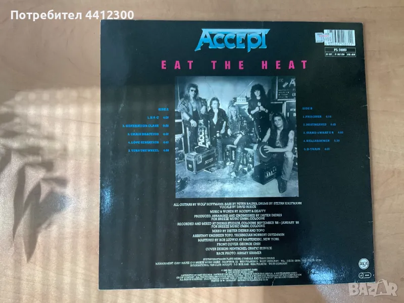 Здравейте, грамофонна плоча 12 инча Accept- eat the heat. Не нося отговорност за състоянието на плочите, не почиствам плочи, ако имате въпроси, може да ми звънете на посочения номер или да ми напишете съобщение. Отговарям след 18 часа, цените не се коментират, ако не се вземат повече от 10 плочи. Благодаря, че прегледахте обявата ми. Лек и спокоен ден!