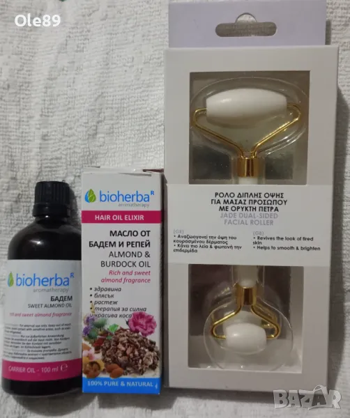 3) 100% масло от бадем. Bioherba Prunus Dulcis Oil е 100% чисто и натурално масло от сладък бадем (Prunus dulcis), извлечено от годни за консумация бадеми, селективно отглеждани заради сладкия им вкус. Етеричното масло от сладък бадем на Биохерба притежава сладък и характерен аромат. Бадемовото масло съдържа витамин А, B1, B2, B6 и Е. Отличава се с богат мастнокиселинен състав и е подходящо за всички типове кожа. Бързо попива, успокоява, подхранва и омекотява кожата, заглажда бръчките. Продуктът на Биохерба стимулира обновяването на епидермиса, поради което е много ефективно в борбата със стрии и загубата на еластичност на проблемни участъци на кожата. Самостоятелно или в комбинация с други растителни и етерични масла е подходящо за масаж на лицето и тялото.