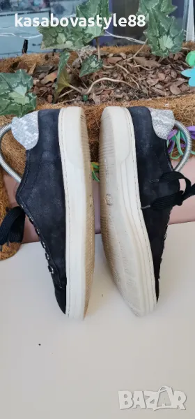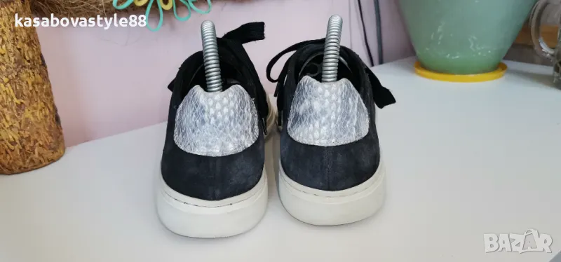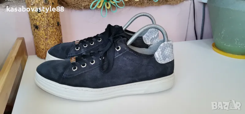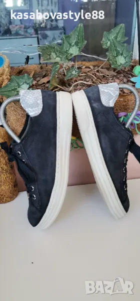 Обувките са в много добро състояние, без забележки. Изработени са от естествен велур в син цвят и елементи от кожа отзад на петата в змийски принт. Вътрешната част е от кожа и мека комфортна текстилна стелка. Тези обувки са много надеждни и устойчиви при носене. Отговарят на 38.5н.Дължина на стелка 25см.Отзад са високи 9см.Ходило 2см.