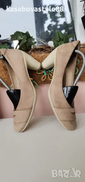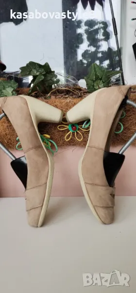 Дамски елегантни обувки от естествена мека на допир кожа в бежов цвят.Отлично състояние. Вътрешната страна е също от кожа, включително и стелката. Токът е с височина 10см. Цялостна височина отзад 14.5см.Дължина на стелка 24.8см.Подходящи за дами с много тънко стъпало.