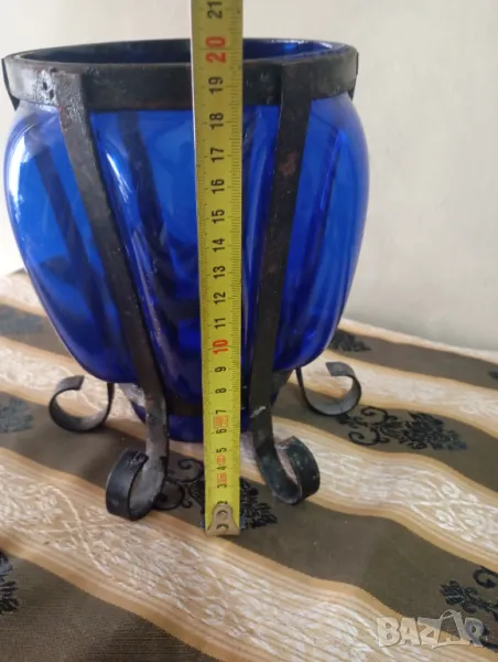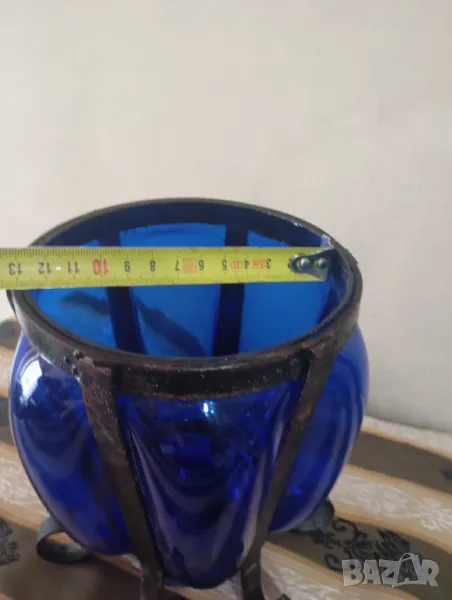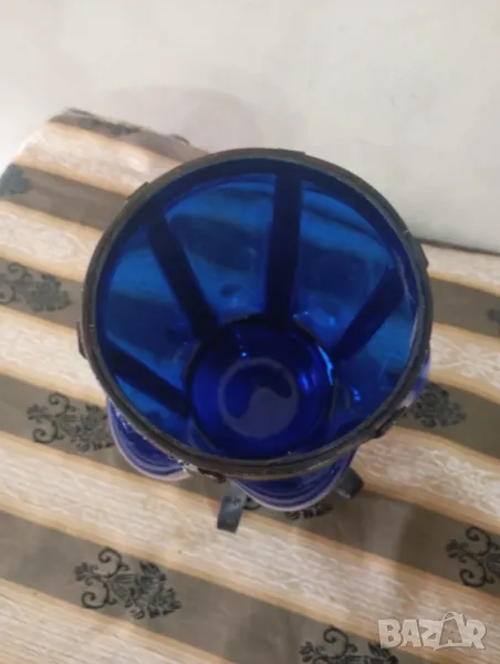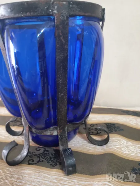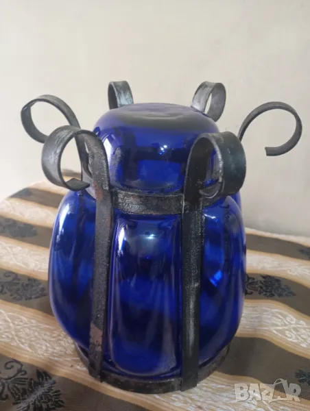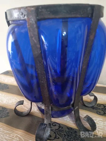 Синю стъкло с ръчно изработен обков от ковано желязо.наченки на ръжда по обкова