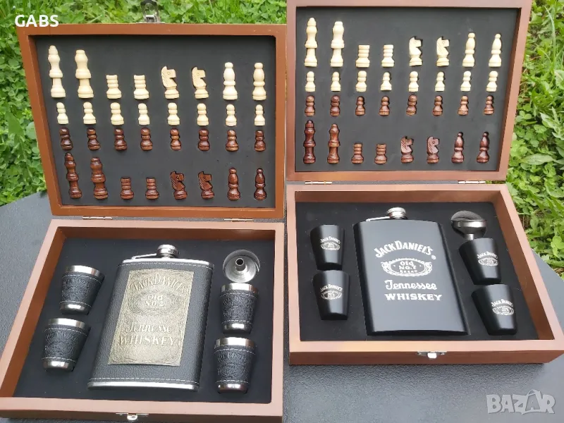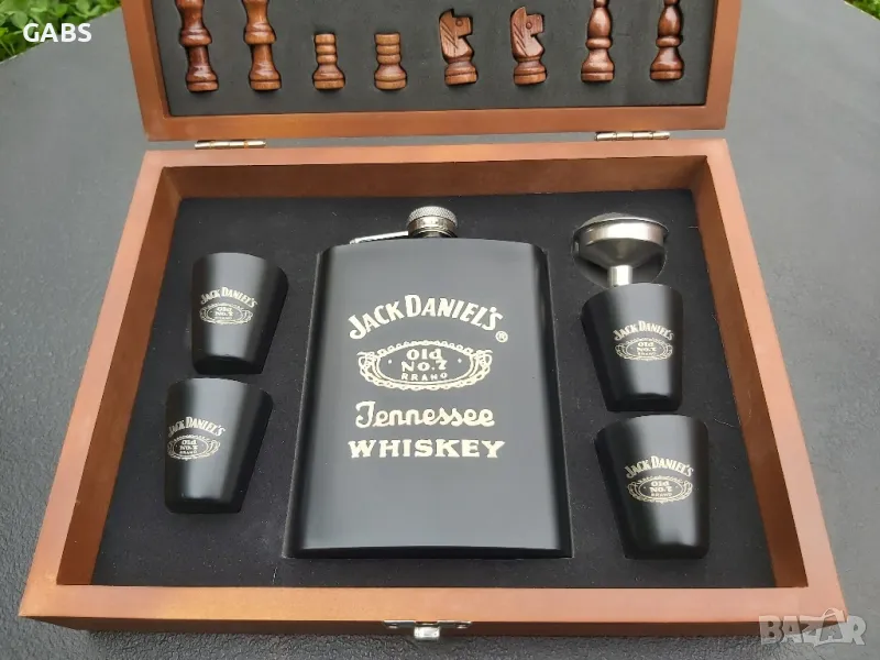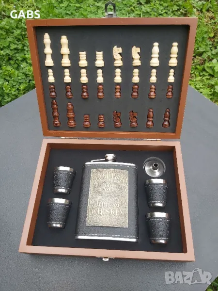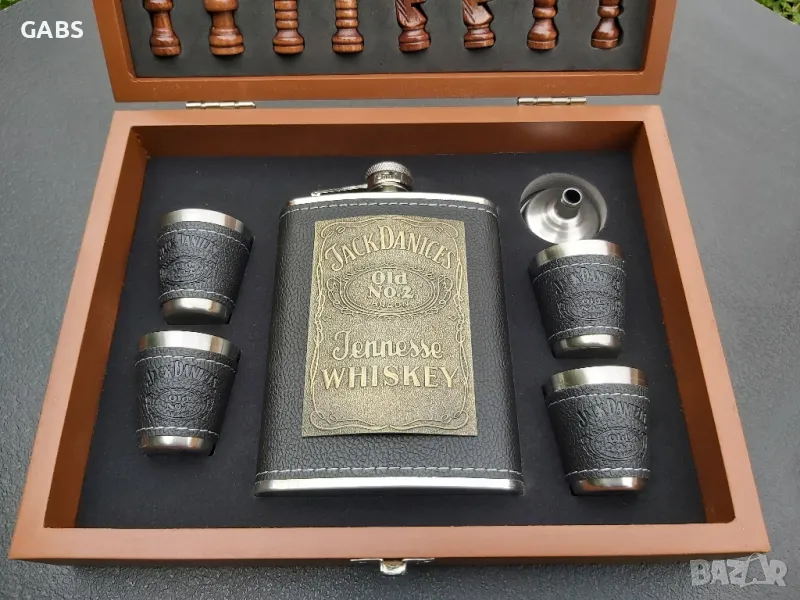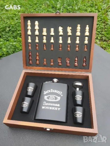 Стилен подаръчен комплект ШАХ Jack Daniel's -манерка за алкохол, чашки и фунийка.Комплекта се предлага в изискана дървена кутия с изобразена дъска за шах.Предлага се в два варианта.Всички части са красиво разположени в кутията.Комплекта съдържа:
