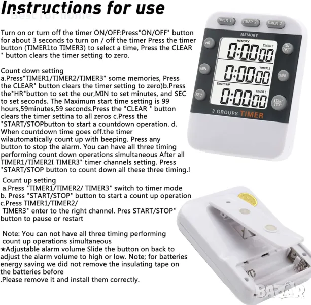 [3-канален брояч]: Цифровият 3-посочен таймер може да се стартира индивидуално или едновременно. Таймерът варира от най-малко 1 секунда до максимум 99 часа, 59 минути и 59 секунди, за да наблюдава до 3 събития едновременно.