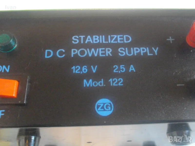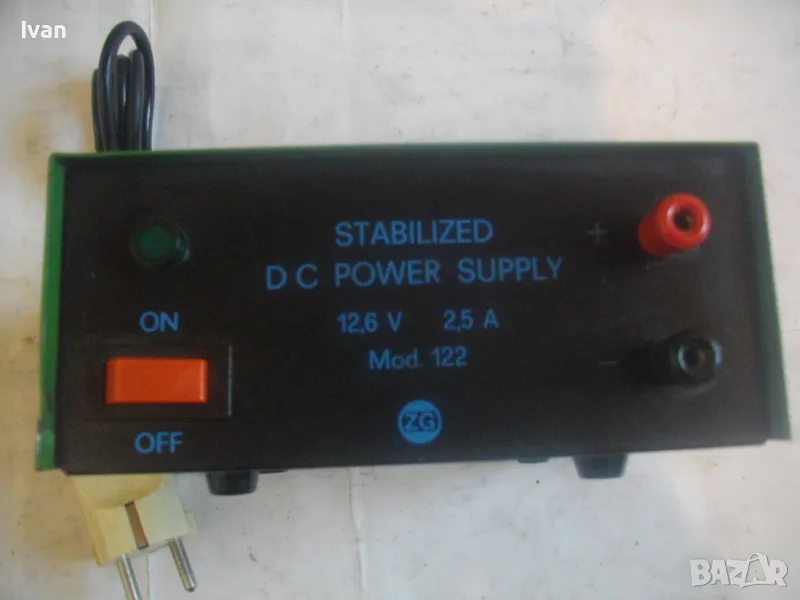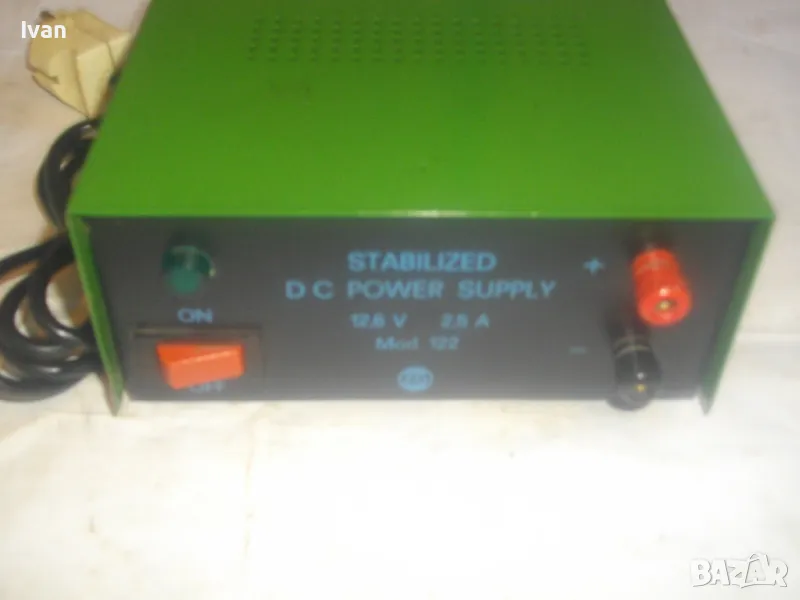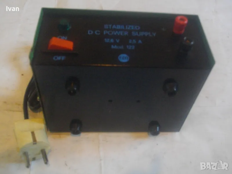 стабилизатор за постоянен ток от 220 волта на 12,6 волта. Бушона е изгорял и има счупен държач за бушончето. Вътре електрониката е здрава. Уреда е старо качество. Маркировки: STABILIZED DC POWER SUPPLY Mod.122