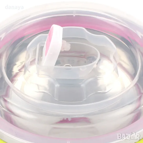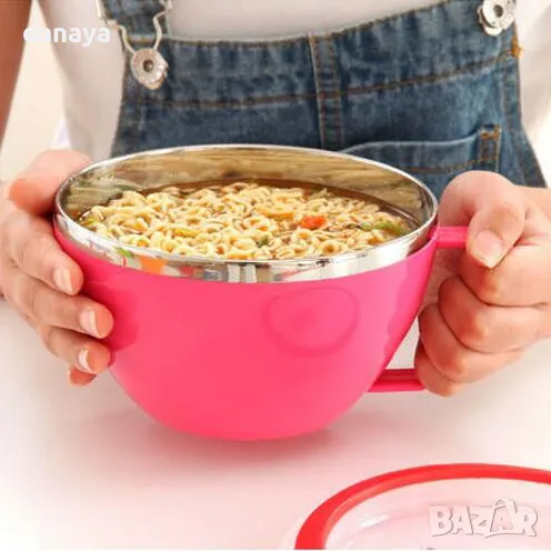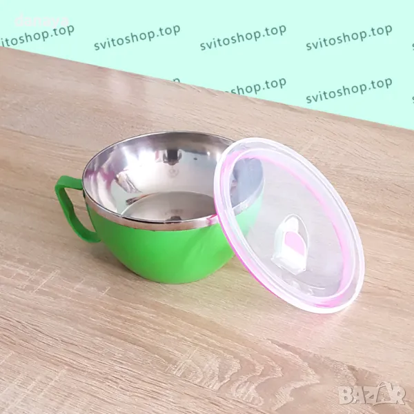 Чаша за супа с вакуум капак и дръжка. Купа за храна с вместимост 500ml. Вътрешната й част е метална неръждаема повърхност, а отвън е с пластмасово покритие. Капакът има силиконово уплътнение, който създава вакуум при сипването на топла храна. Освен това капакът има и отвор за изпускане на парата. Чашата с размери на купичка е идеална за приготвяне на полуготови спагети или други храни. Чудесна за обяд за работа или извън дома. Предлага се в 3 цвята – оранжев, зелен, розов.