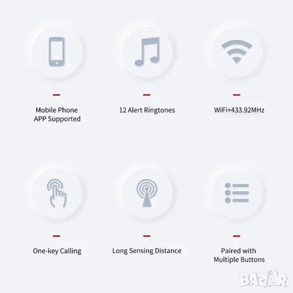 Това е многофункционален пейджър, разработен чрез комбиниране на WiFi+RF технология, използван главно за кражби, звънене на врата, повикване на възрастни хора и др. Удобен за използване за обаждания за помощ на възрастни хора, аларма при отваряне на врати и прозорци, подкани на звънец на врата и др. Поддържа избор на мобилен телефон на различни звуци на музикално обаждане и дистанционно управление на мобилно приложение.