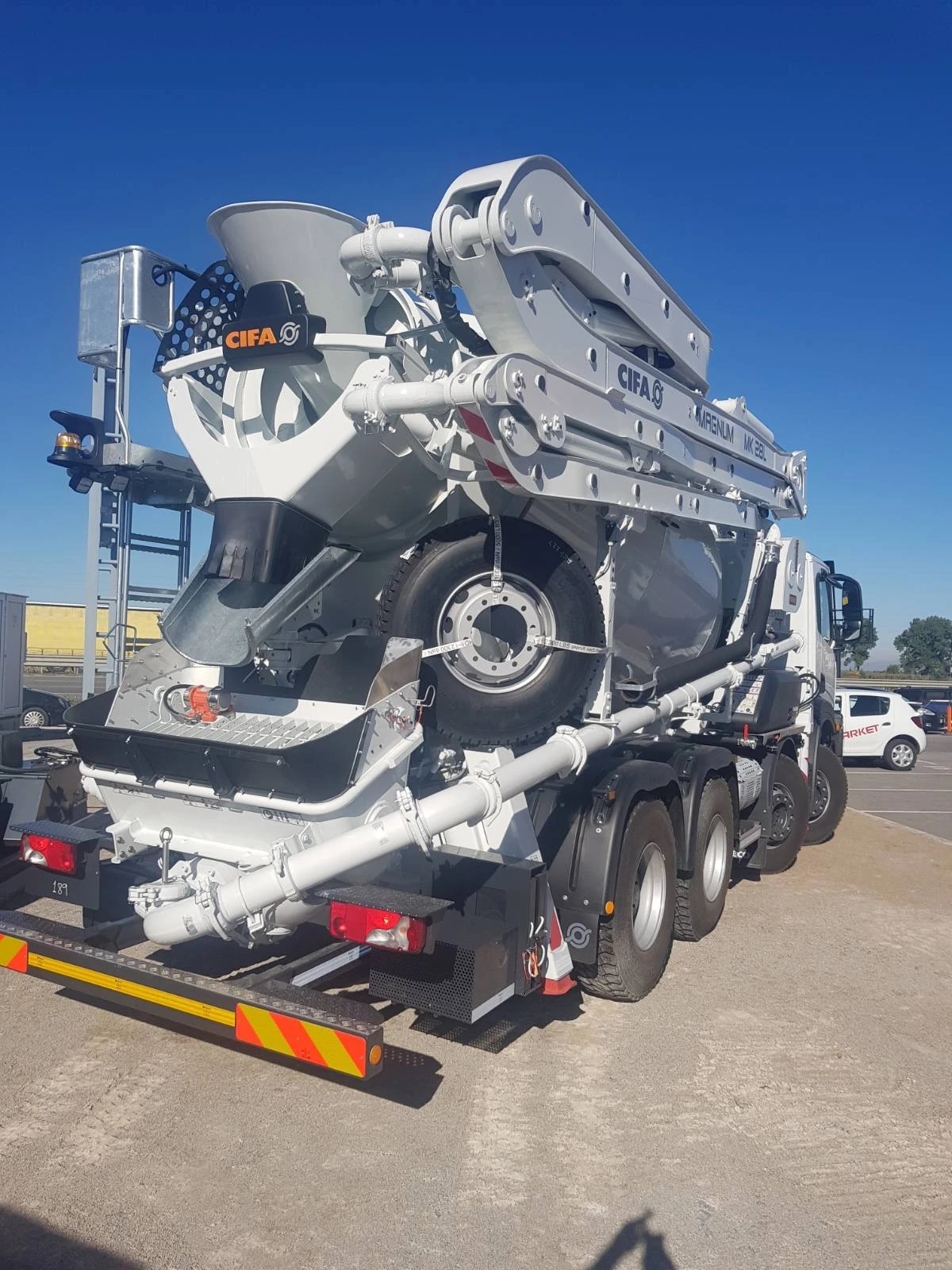 НОВ нерегистриран автомобил IVECO T-WAY с Надстройка: CIFA СТРЕЛА: MK28L МИКСЕР: RH115 ПОМПЕН МЕХАНИЗЪМ: PB607S7 Диаметър на тръбите 100 mm Максимален вертикален достъп 28, 1 m Максимално хоризонтално разстояние 24, 1 m Брой на секциите 4 Дължина на маркуча 4 m Миксер Номинален обем 9 m3 Геометричен обем 14, 6 m3 Капацитет на пълнене 61% Максимална скорост на въртене 14 rpm Обем на водния резервоар 800 L Капацитет на водната помпа / налягане 230 L /15 bar Помпен механизъм Максимална теоретична производителност 61 m3/h Максимално налягане на бетона 71 bar Максимален брой на циклите в минута 32 Цилиндри (диаметър х ход) 200 x 1000 mm Обем на бункера за бетон 400 L iTRUCKS е оторизиран дилър на IVECO в България. Автомобилът е наличен за оглед и тест в складова база iTRUCKS - гр. София Посочената цена е без ДДС!