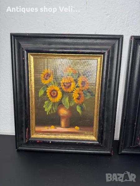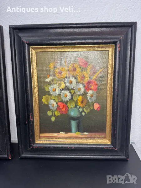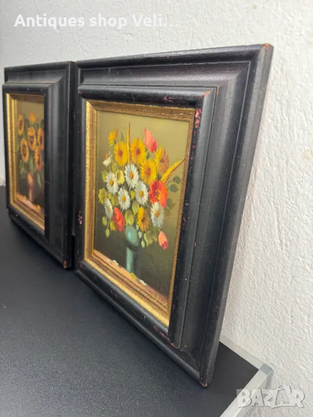 Чифт авторски картрини натюрморт с рамки рисувани върху шперплат с маслени бои. Добро състяние. Предлагаме доставка с Еконт и лично предаване за градовете Велико Търново, Русе и Сливен. Размери-37,5/32,5см.