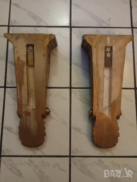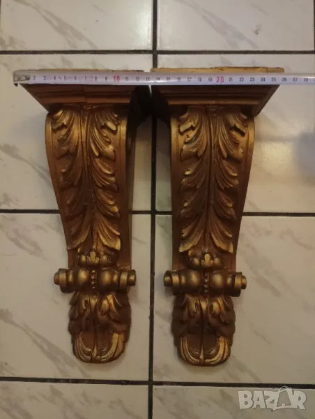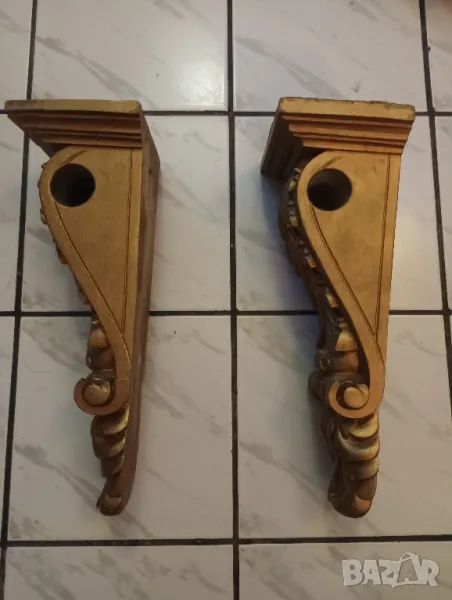 Комплект два позлатени, резбовани корбела, скоби за стенен рафт, за корниз за перде, за декорация в Бароков стил. Единият е изработен от алабастър, другият от полинезин и двата са плътни. Отлично състояние, няма забележки. Еконт, Спиди, лично предаване.