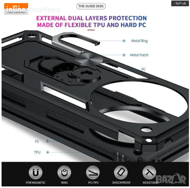 • Metal Ring- пръстена е с метална конструкция, благодарение на което, той безпроблемно функционира с магнитни държачи за телефони (магнитния държач не включен).
