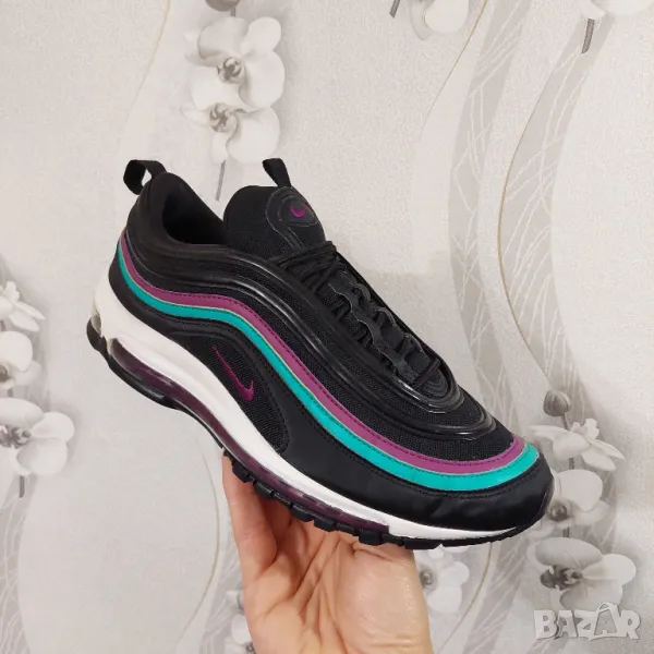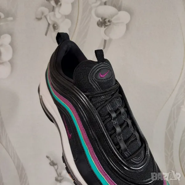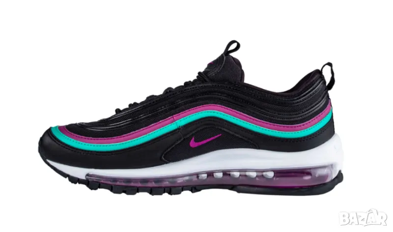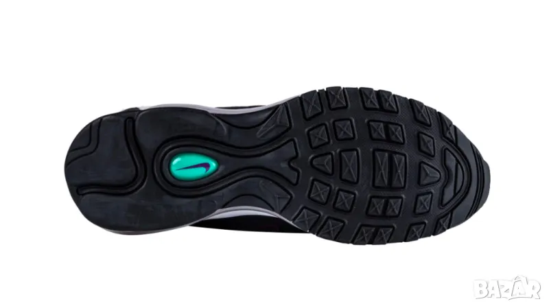 , този Air Max 97 обръща популярната лилава и аква цветова схема с черна основа, за да контрастира с наскоро пуснатата