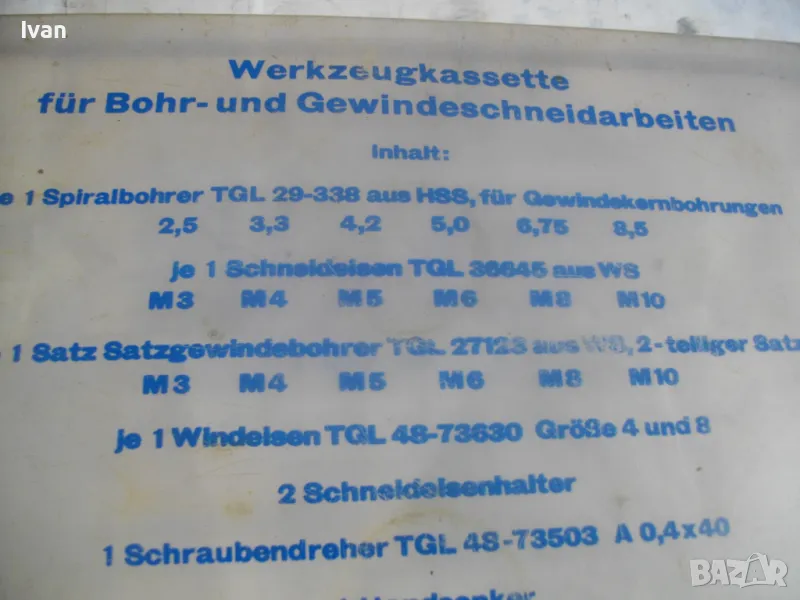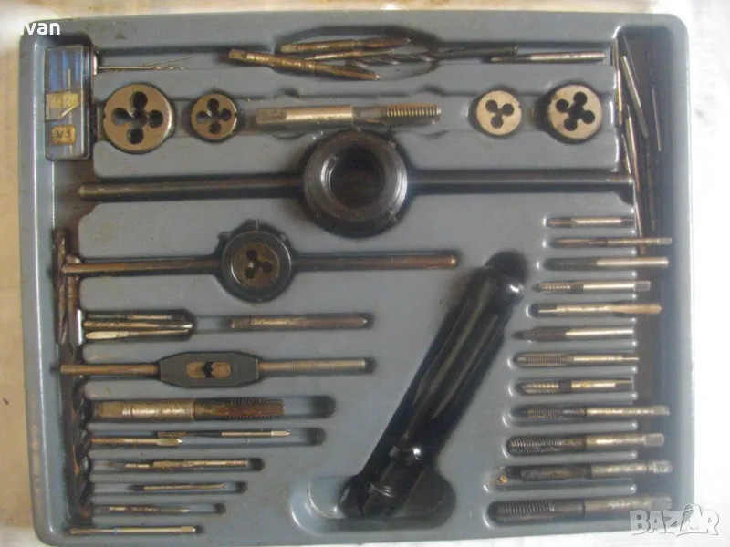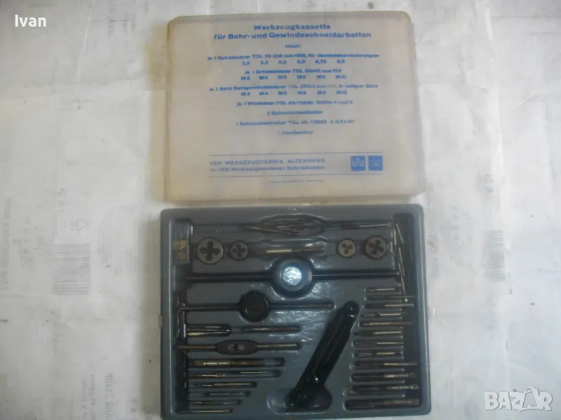 ОПИСАНИЕ на голям 58 части немски комплект за резби - старо качество - професионален VEB - в ПВЦ кутия голяма - 155 евро. Старо качество, немско производство на ГДР комплект метчици и плашки за външни и вътрешни резби от 2,5 мм до размер М10, висок клас доказало се във времето производство професионално на VEB.