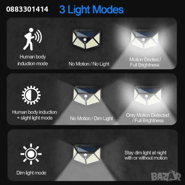 С три режима на работа- Задействане при движение и изключване при липса на такова, постоянна работа на 80% мощност и постоянна работа на 10% и увеличаване до 100% при засичане на движение и намаляване отново до 10% при липса на такова.