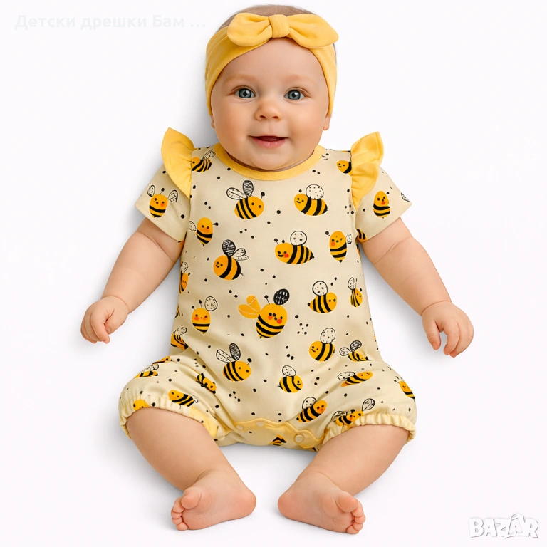 Потопете се в слънчевото настроение с този очарователен бебешки ромпър с пчелички и лента за глава с панделка – създаден за усмивки, комфорт и стил!