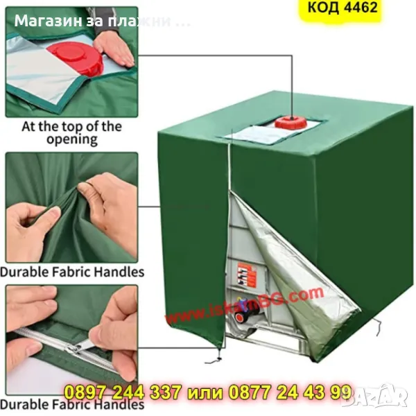 Предпазете вашия IBC контейнер от UV лъчи, дъжд, сняг и замърсявания с издръжливото покривало от Oxford 210D. То намалява достъпа на светлина, предотвратява образуването на водорасли и удължава експлоатацията на водата. Лесен монтаж, универсален размер и цип за удобен достъп.
