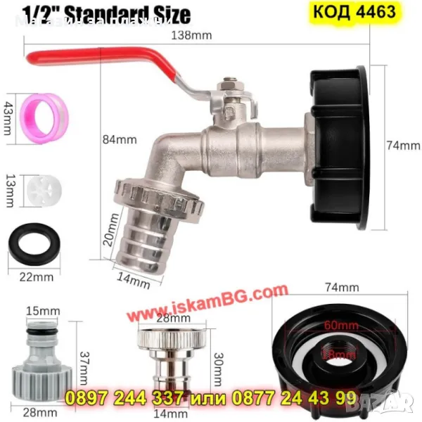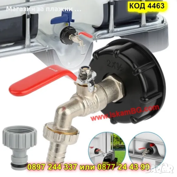 Комплектът включва капачка преход S60x6 с резба и кран за IBC бидон 1000 л. Осигурява лесно свързване на маркуч за поливане, капково напояване или миене.