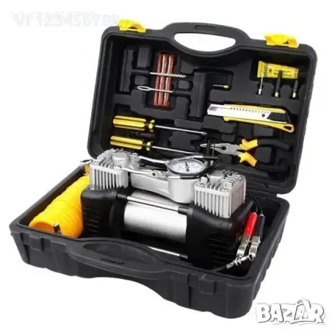 Компресор с изключително здрав метален корпус.Удобен и здрав пластмасов куфар, комплект инструменти за ремонт на безкамерни гуми.
