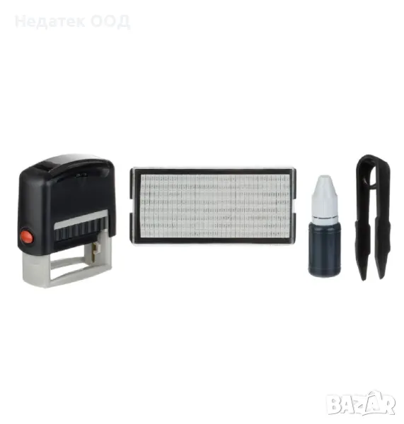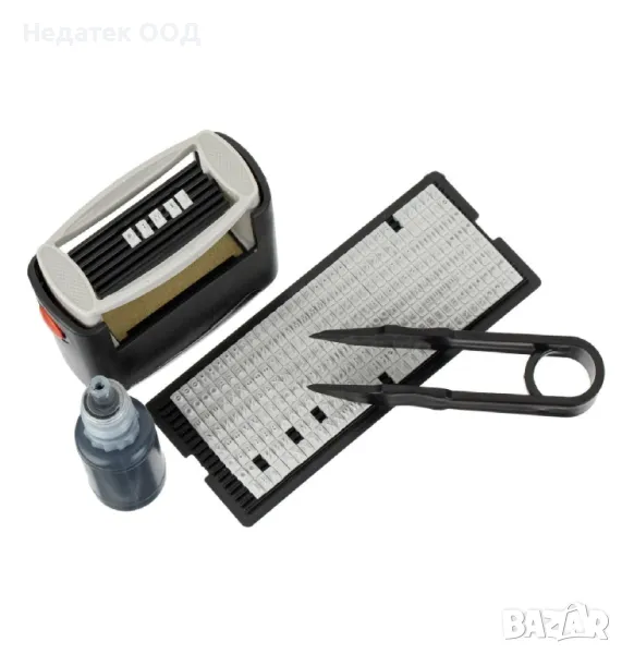 Щампова машина за етикети с черно мастило за отпечатване на етикети за различни цели. Подходящи са и за дрехи. Съдържа цифри, символи и букви (малки и главни на различни езици). Създавайте етикети за вашите лични вещи, организирайте файлове и формуляри и маркирайте името на детето си върху дрехите, така че да не се бърка с дрехите на другите деца в училище.