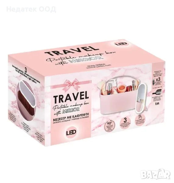 Преносим козметичен куфар за съхранение и транспортиране на тоалетни принадлежности, с функция за осветяване на огледалото или с батерии, или с USB кабел за зареждане. Свалящият се капак - огледало може да стои с помощта на вдлъбнатината вътре в кутията, а ъглите да се регулират чрез завъртане или да стои на масата отделно. Има три режима на светене, топло, студено, двойни светлини и възможност за регулиране на яркостта с дълго докосване. Има дръжка за носене и USB кабел. Работи с 3 батерии AAA (не са включени).