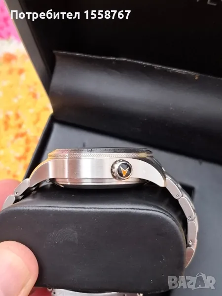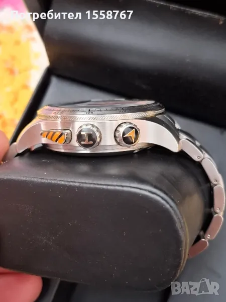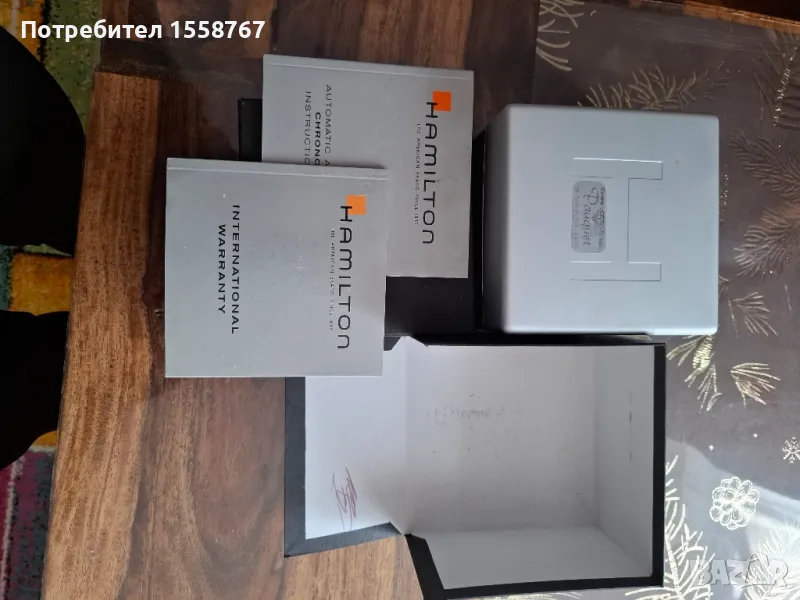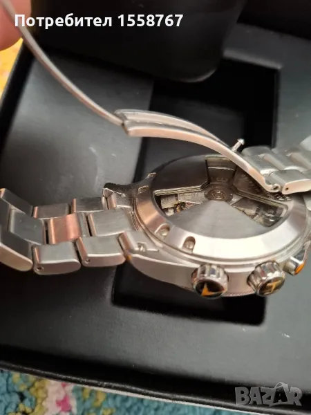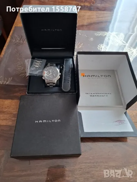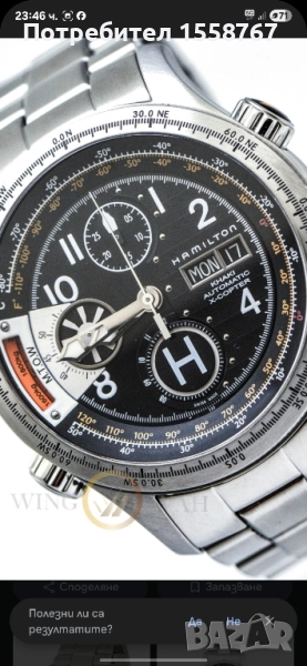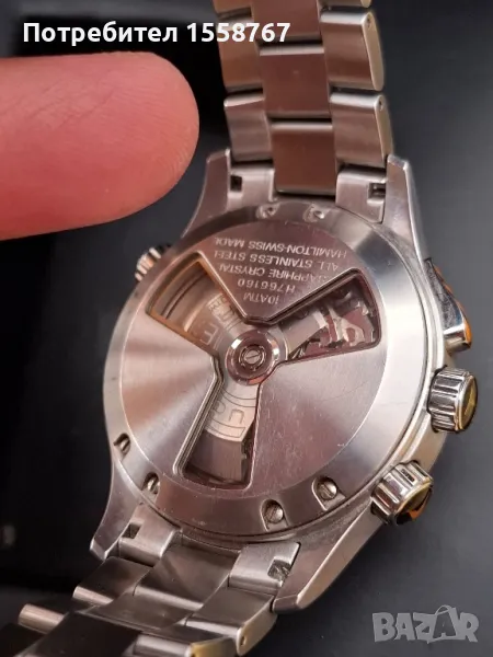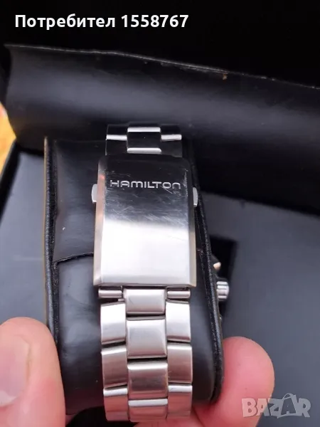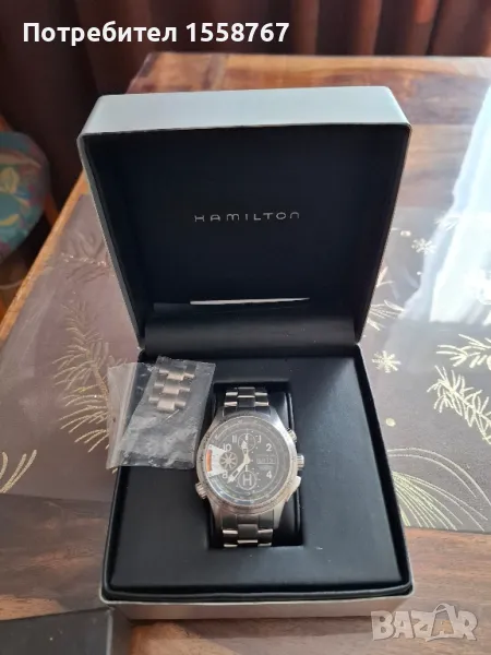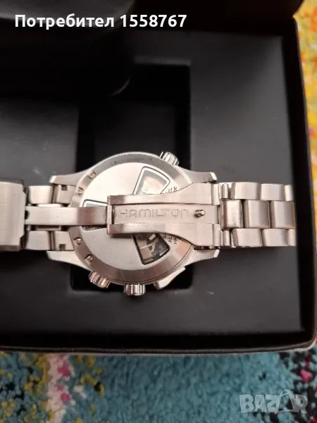часовник hamilton хронограф на Valjoux 7750 Х-Copter е военен/пилотен часовник от известната колекция Hamilton Khaki. Часовникът е с размер 45 мм и е малко по-тежък от обичайните часовници, тъй като е с дебела стоманена верижка ,корпуса е от масивна стомана,стъклото е Сапфир Кристал.Часовникът е използван и има много леки следи от употреба, който не се забелязват.Бутоните са запазени както в първоначалното състояние няма протриване.Часовникът е пазен така че Механизмът му работи перфектно хронографа работи абсолютно всичко по него е изправно aко имате някакви въпроси моля ще ви отговоря с удоволствиеДИЗАЙНТова, което ме привлече към този часовник, беше мотивът на хеликоптера. По-специално, циферблатът за секунди в позиция 9 часа изглежда като въртящ се ротор на хеликоптер.Има дори „циферблат“ на хеликоптерна площадка на позиция 6 часа с голямо „H“ за Хамилтън или хеликоптерна площадка – или дори H за „час“ – защото, докато H е неподвижен, има червена точка, която го обикаля чрез тънка очертана бразда, прекъсната от точки на нитове, обозначаващи изминалите часове, когато се използва функцията на хронографа. Освен това има дори 30-минутен циферблат на позиция 12 часа.А това, което не се забелязва от мнозина, са детайлите по повърхността на циферблата, която е разделена на две. Дясната страна на циферблата има повърхности, които изглеждат като "черен самолет", които са прикрепени към лявата, по-гладка страна с метални нитове, подобно на това как повърхностните панели на самолет или хеликоптер се държат заедно. Оранжевият прозорец на 9 часа е поразителна, подчертана характеристика на часовника, показваща MTOW, която вероятно не е полезна за обикновения потребител, освен ако той или тя не е пилот.