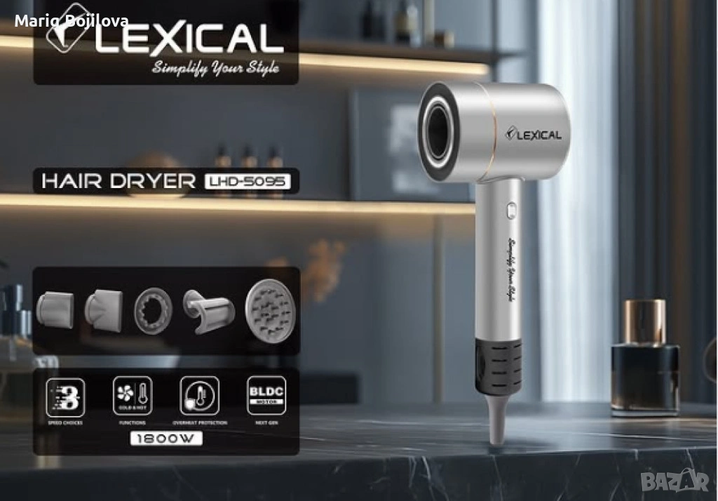 Тип продукт: Сешоар за коса;Сешоар Lexical LHD-5095 Turbo Force е мощен и иновативен уред, който осигурява ефективно сушене и стилизиране на косата. Мощност: 1800W за бързо сушене.Мотор: BLDC мотор, който осигурява дълготрайна издръжливост и висока ефективност.Напрежение: 220-240V, 50-60Hz.Негативни йони: Функция за кондициониране с негативни йони, която намалява електростатичното натрупване и прави косата по-гладка и блестяща.Регулиране на скоростта: 3 нива на скорост и 3 нива на температура.Въртяща се скорост: Моторът достига до 100,000 об/мин, което осигурява бързо и ефективно сушене.Магнитен въздушен накрайник.Функция за студен въздух.Защита от прегряване: Предотвратява повреда на мотора и увеличава безопасността при употреба.Гаранция: 24месеца.