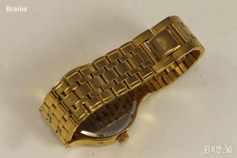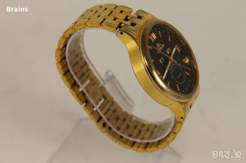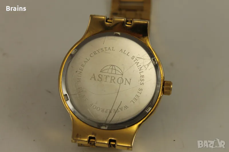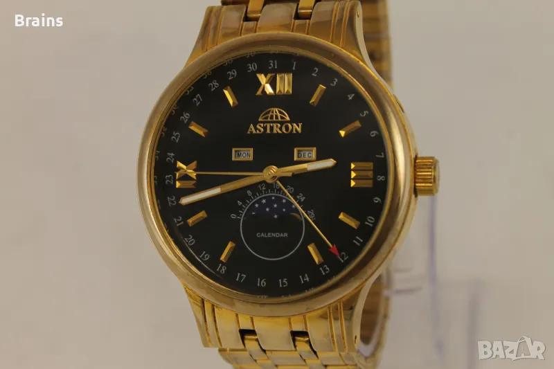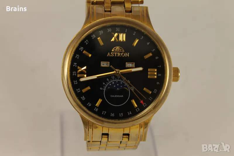 Мъжки ръчен кварцов часовник ASTRON. Със лунна фаза и пойнтер дата, календар и месец от годинита. Изработен от неръждаема стомана със позлата. Отличен черен циферблат. Часовника работи точно, всички функции работят. Верижката е скъсена и става за китка до 20 см.