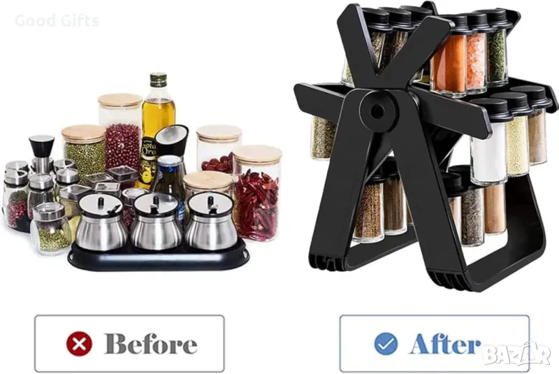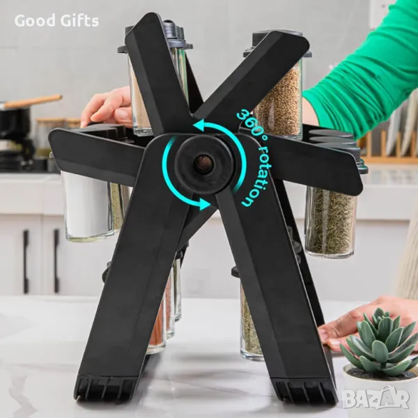Този органайзер е проектиран да бъде компактен и функционален. Той се върти на 360 градуса, което ви позволява лесен и бърз достъп до всяко от бурканчетата. Това ви осигурява удобство и ефективност при готвенето, като намалява времето, което отнема да намерите нужната подправка.