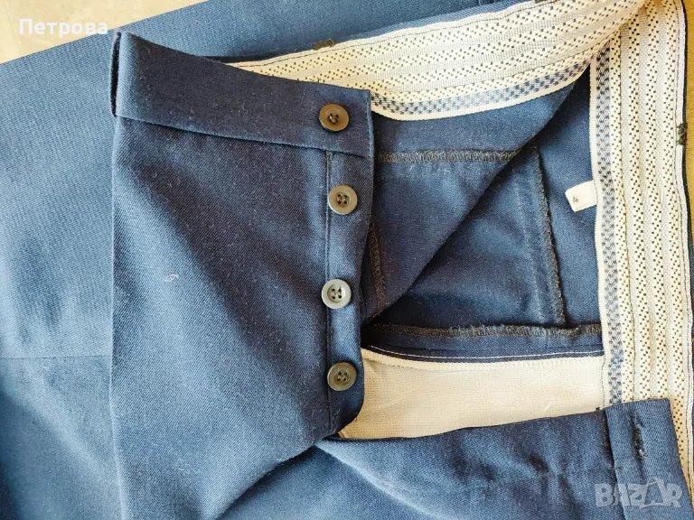 Мъжки панталон, нов, вълнена материя, тъмносин, 44 размер, дължина 100 см, талия 76 см, ханш 100 см. Цена 10 лв. Изпраща се с 10% отстъпка от общоприетата куриерска такса.